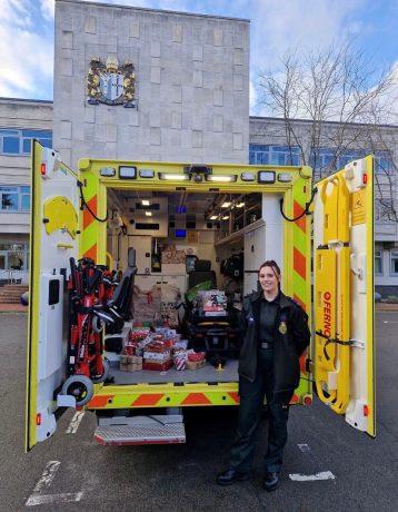 London Ambulance Medical Emergency Technician Ellie Buckley picked up presents kindly donated by Trinity School in Croydon and delivered them to children on the oncology unit at Croydon University Hospital.